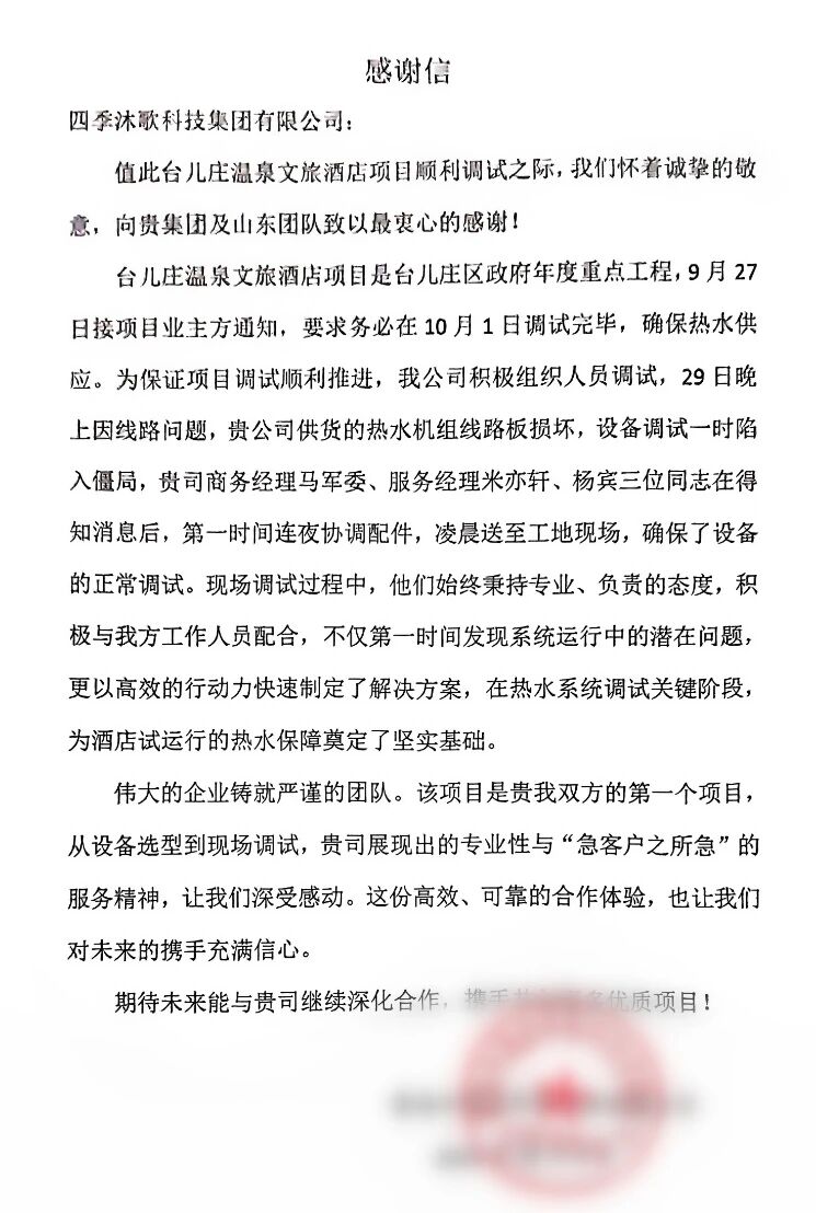 為趕工十一黃金假期的關(guān)鍵時(shí)間點(diǎn),9月底臺(tái)兒莊溫泉文旅酒店熱水項(xiàng)目現(xiàn)場(chǎng),當(dāng)?shù)毓こ谭?wù)公司正加班加點(diǎn)進(jìn)行設(shè)備的安裝、調(diào)試工作,但由于線路操作不當(dāng),導(dǎo)致四季沐歌部分熱泵熱水機(jī)設(shè)備無(wú)法正常啟動(dòng),調(diào)試工作陷入停頓。頂著工期迫近的巨大壓力,工程服務(wù)公司負(fù)責(zé)人深夜撥打了四季沐歌山東濟(jì)南營(yíng)銷中心團(tuán)隊(duì)對(duì)接人的電話,了解清楚原委后,四季沐歌服務(wù)團(tuán)隊(duì)立即往項(xiàng)目現(xiàn)場(chǎng)進(jìn)行處理,協(xié)助工程服務(wù)公司提前完成項(xiàng)目熱水的調(diào)試工作,并給予標(biāo)準(zhǔn)化操作的建議、幫助排除系統(tǒng)運(yùn)行的潛在問題。通過此次事件,四季沐歌專業(yè)化服務(wù)給工程公司留下了深刻印象,奠定下工程公司與四季沐歌長(zhǎng)期合作的信心。