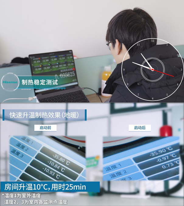 在室外溫度接近-40℃的超低溫環(huán)境下,海信紅焰雙高效系列機(jī)組可正常啟動,無故障、無報(bào)警,運(yùn)行穩(wěn)定。與此同時(shí),制熱速度和制熱效果也是影響熱泵機(jī)組采暖體驗(yàn)的重要一環(huán)。經(jīng)實(shí)際測試,海信紅焰雙高效系列使房間升溫10℃用時(shí)僅需25min。在室外溫度保持在-40℃~-23℃的范圍內(nèi)時(shí),室溫可穩(wěn)定在18℃以上。