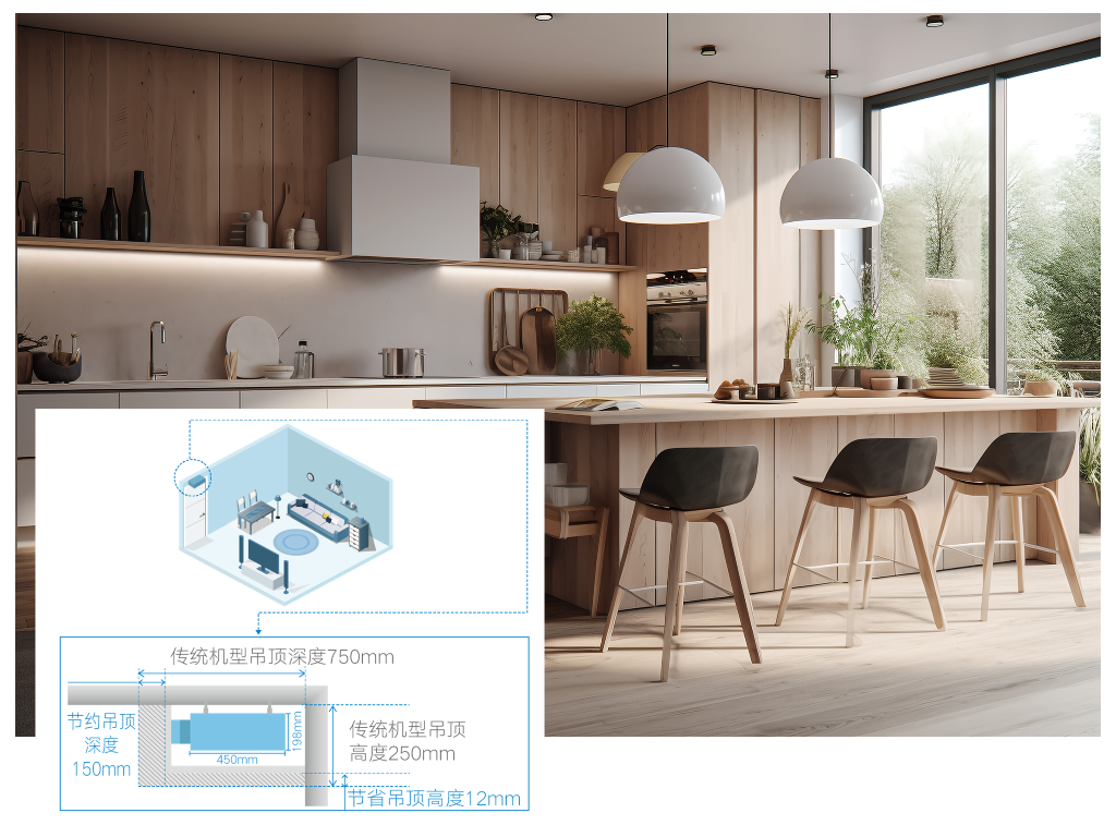 ◎198mm超薄機(jī)身,輕松安裝在陽臺與客廳連接處,釋放更多吊頂空間;