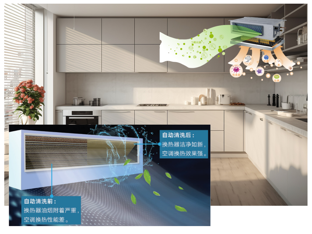 ◎ 清潔 進(jìn)行除霜,將換熱器表面的油煙顆粒帶走;