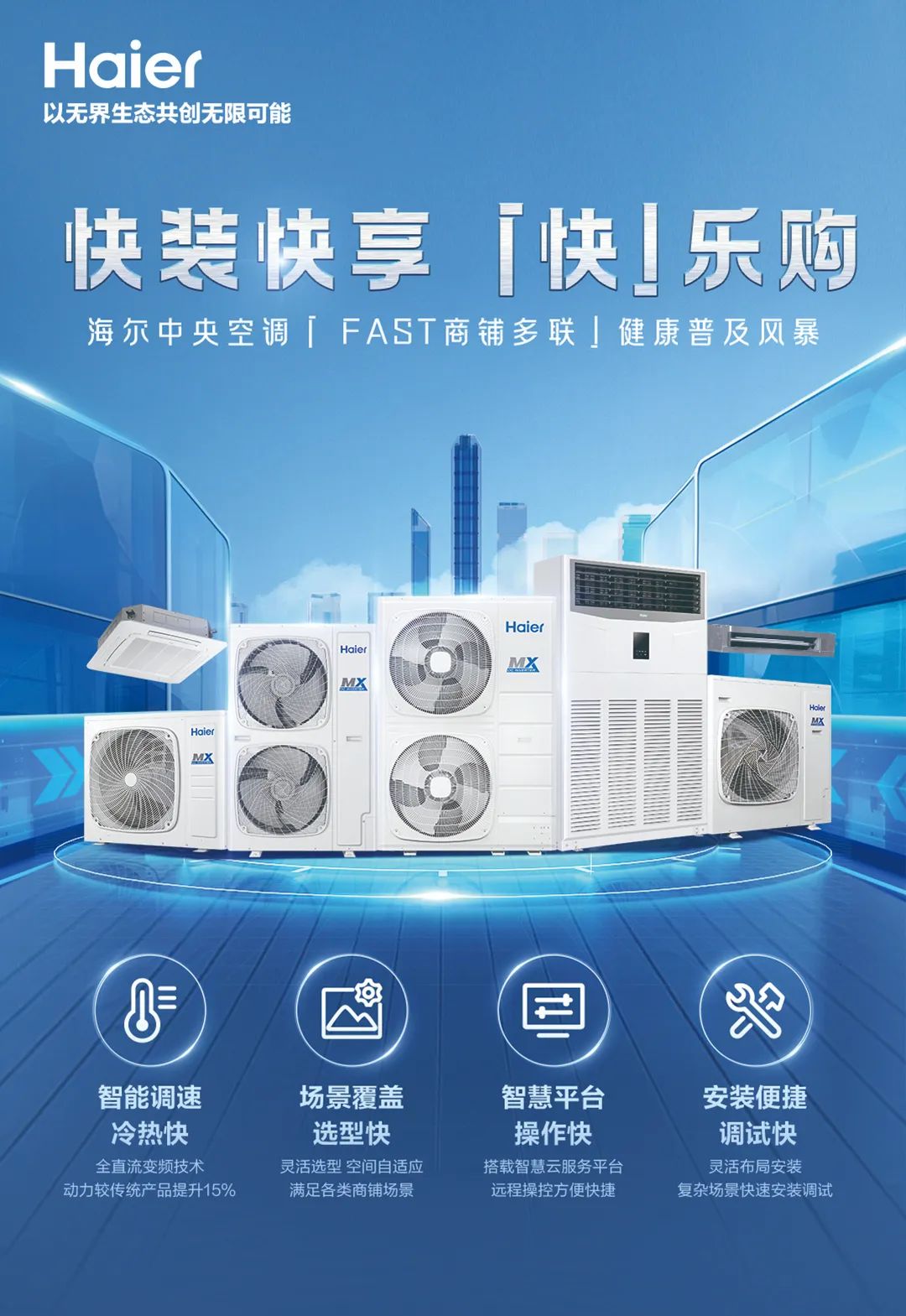 海爾中央空調(diào)深入剖析多聯(lián)機(jī)市場環(huán)境及發(fā)展動(dòng)態(tài),推出的「FAST商鋪多聯(lián)」系列產(chǎn)品,擁有四大「快」實(shí)力。包括智能調(diào)速 冷熱快、場景覆蓋 選型快、智慧平臺(tái) 操作快、安裝便捷 調(diào)試快。憑借專業(yè)的產(chǎn)品性能,幫助客戶精準(zhǔn)定位市場需求,快速鎖定目標(biāo)群體。