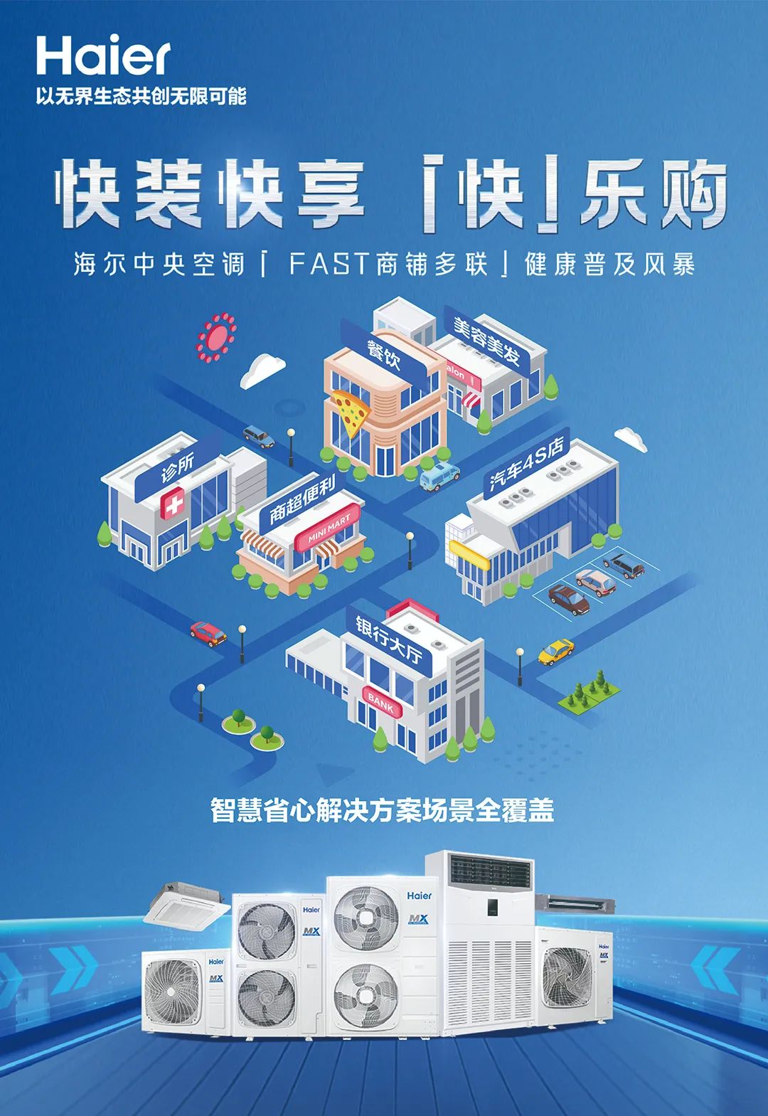 中小商戶類型眾多、規(guī)模不一,對多聯(lián)機(jī)的核心需求也是不同的。為滿足不同場景下的個(gè)性化需求,海爾中央空調(diào)提供FAST多聯(lián)、大風(fēng)管、商用專用柜機(jī)及增值模塊等多樣化的產(chǎn)品組合,為用戶提供定制化的商鋪全場景智慧低碳解決方案。