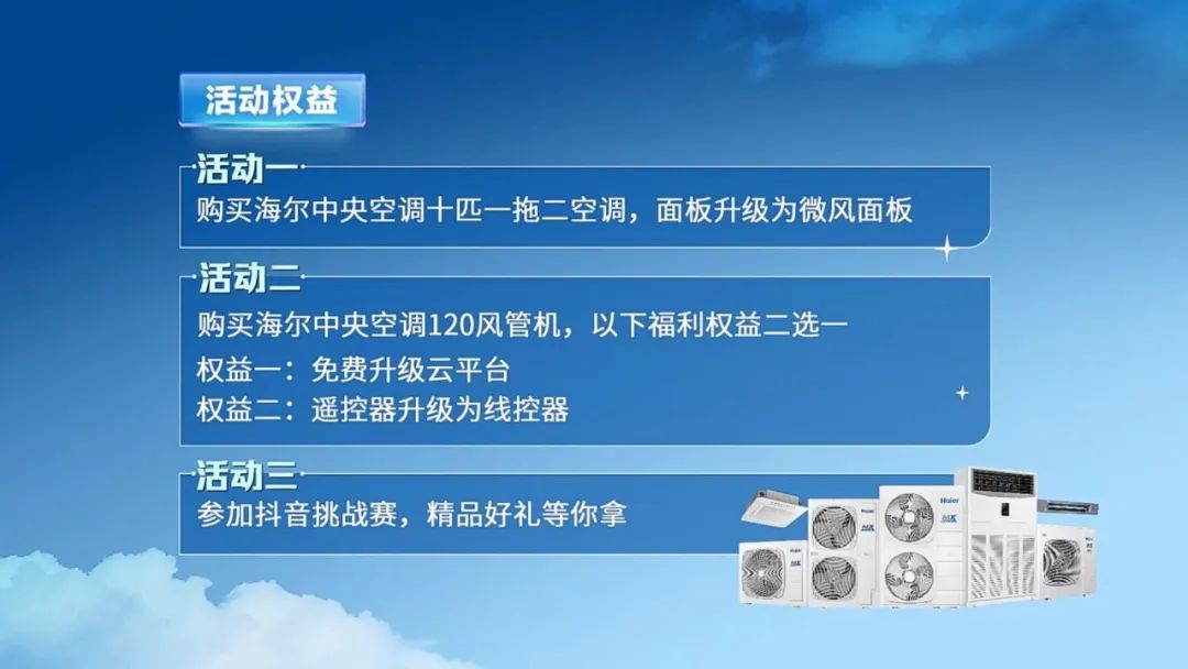 本次海爾中央空調(diào)「FAST商鋪多聯(lián)」健康普及風(fēng)暴活動(dòng)已于本月25號(hào)正式啟動(dòng)。2月25日-4月25日,只要參與下列活動(dòng),即有機(jī)會(huì)享受免費(fèi)升級(jí)權(quán)益。