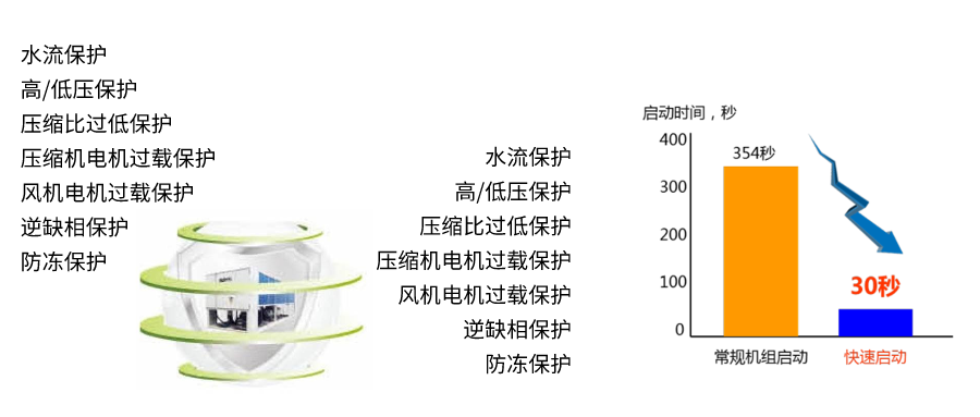 系統(tǒng)具有多重保護(hù)措施以及自診斷和故障報(bào)警功能,及時(shí)發(fā)現(xiàn)并解決系統(tǒng)故障以確保系統(tǒng)安全運(yùn)行。如故障備運(yùn)轉(zhuǎn)、過(guò)載保護(hù)、缺相保護(hù)、高/低壓保護(hù)、防凍保護(hù)等二十多項(xiàng)保護(hù)功能。此外,機(jī)組可以在恢復(fù)通電后30秒內(nèi)重啟壓縮機(jī),在最短的時(shí)間內(nèi)恢復(fù)至斷電前的運(yùn)行狀態(tài),保障用戶使用體驗(yàn),進(jìn)一步提高系統(tǒng)的可靠性和穩(wěn)定性。
