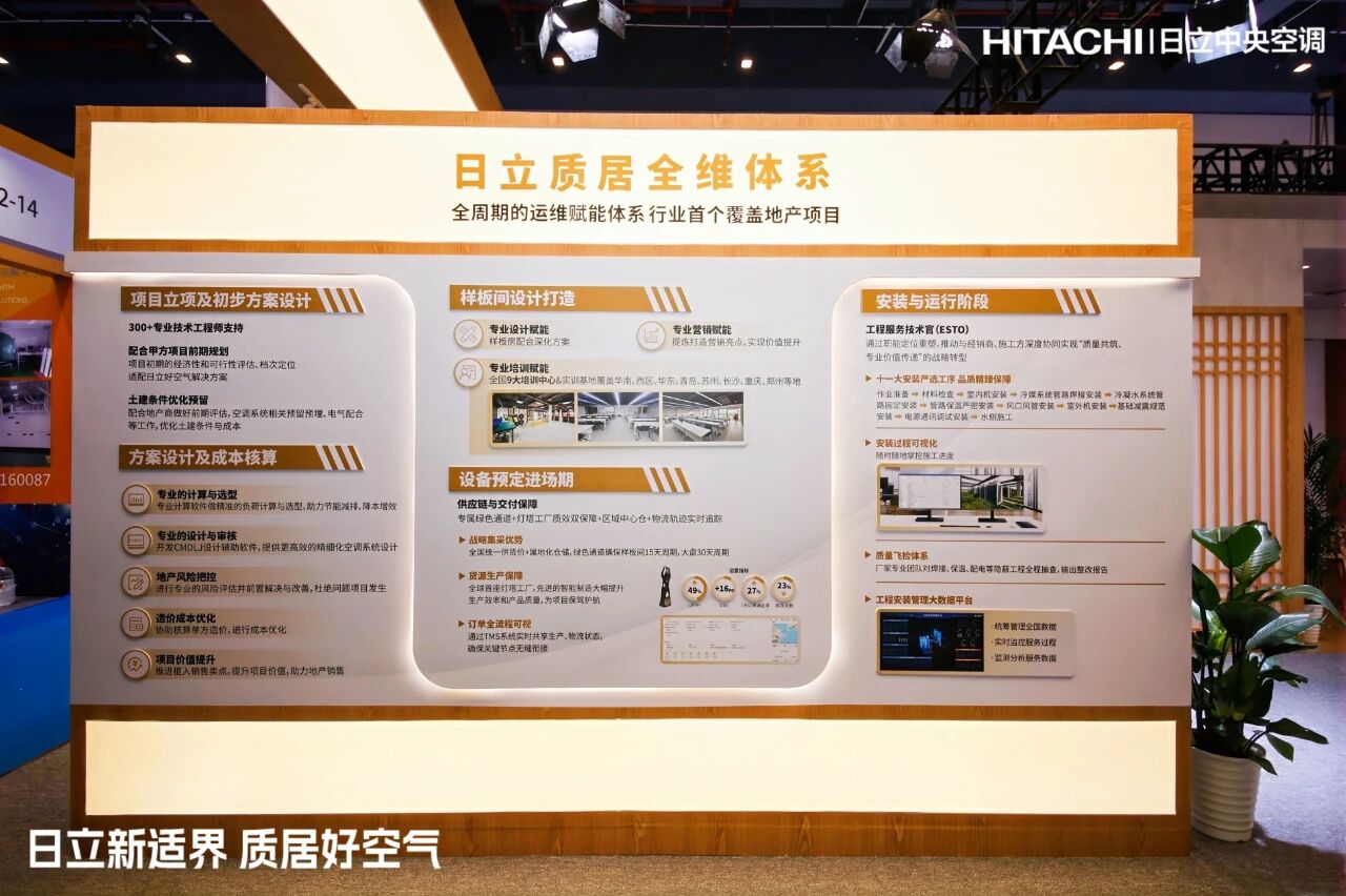 本屆展會,“日立質(zhì)居全維體系”同時重磅發(fā)布。作為行業(yè)首個覆蓋地產(chǎn)項(xiàng)目全生命周期的運(yùn)維賦能系統(tǒng),該體系致力于從前端設(shè)計、中期施工到后期運(yùn)維,為項(xiàng)目提供全鏈路、系統(tǒng)化的品質(zhì)保障,真正實(shí)現(xiàn)從提供產(chǎn)品設(shè)備到全周期價值的服務(wù)升級。