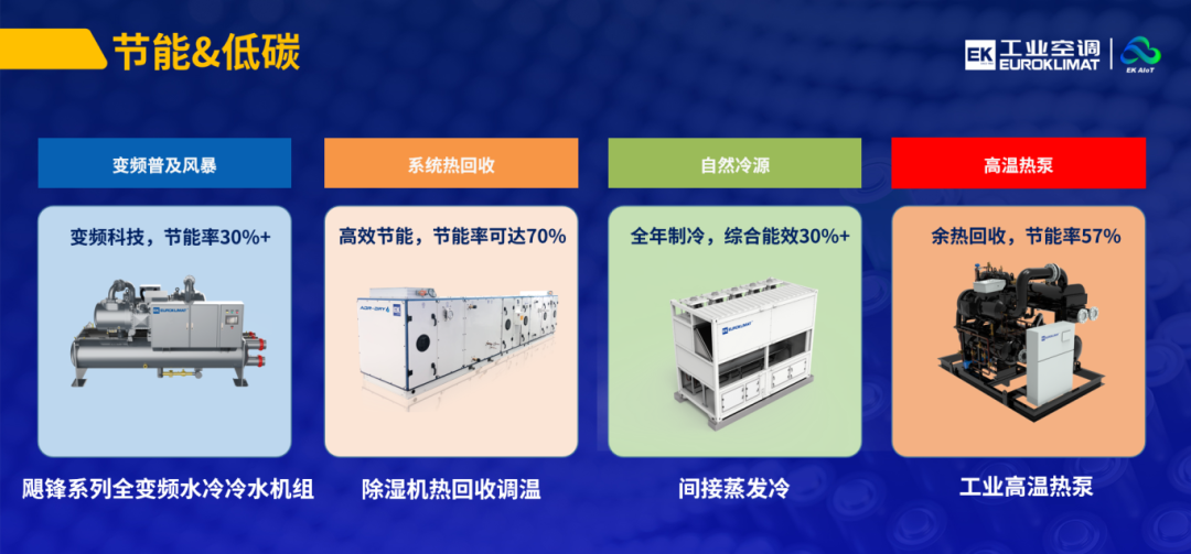 節(jié)能與低碳方面,EK工業(yè)空調(diào)不斷突破技術(shù)瓶頸,通過在變頻普及、系統(tǒng)熱回收、自然冷源和高溫?zé)岜玫燃夹g(shù)領(lǐng)域的布局,持續(xù)降低系統(tǒng)能耗與碳排放。