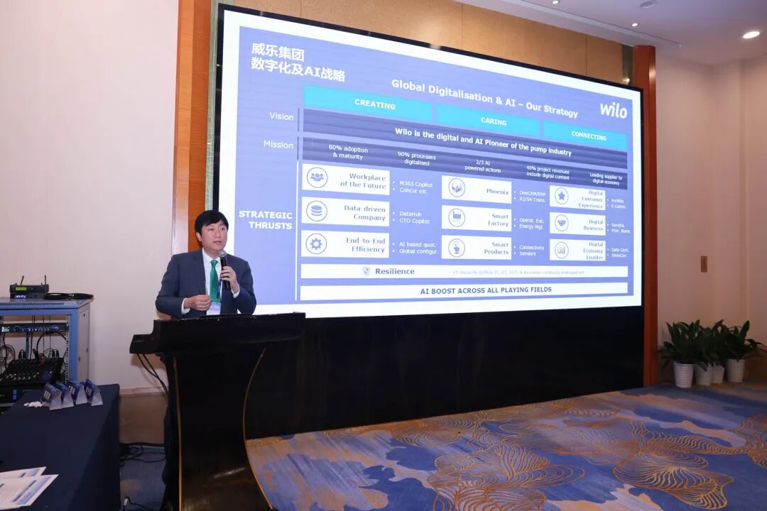 肖總介紹了威樂集團的IT架構(gòu),同時以集團總部Wilopark的MES生產(chǎn)執(zhí)行系統(tǒng)和自適應(yīng)工人輔助系統(tǒng)為例,展示了如何以數(shù)字化和AI賦能生產(chǎn)管理,在大幅提升產(chǎn)能的同時降低產(chǎn)品不良率;又以Wilo-Magic Cube pro 系列智能循環(huán)回水器“水魔方尊享版”Wilo-Rexa SOLID-Q系列高效智能污水泵兩款威樂明星產(chǎn)品為例,展示了數(shù)字化和AI如何為產(chǎn)品賦能,給客戶帶來全新的體驗和價值。從不同維度為行業(yè)同仁詮釋了威樂集團的“Pioneering WATER AI for You”(威樂以WATER AI創(chuàng)新為您)的價值主張。