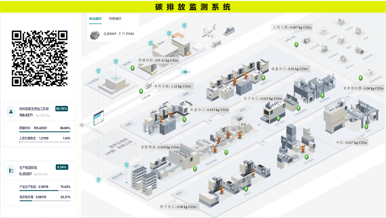 其電機制造工廠早在2018年就取得了國家級綠色工廠稱號,目前也搭建了基于數(shù)字化平臺的碳排監(jiān)測系統(tǒng),生產(chǎn)線上安裝的300多個智能傳感裝置,如同精準(zhǔn)的“碳排探測器”,覆蓋原材料進(jìn)廠到成品出庫的每一個關(guān)鍵工序,實時、精準(zhǔn)捕捉各環(huán)節(jié)的能耗與碳排放數(shù)據(jù),真正做到“要降碳,先尋碳”。這一舉措將設(shè)備綜合效率(OEE)提升了10%,相當(dāng)于每年多產(chǎn)出12萬臺電機的產(chǎn)能。