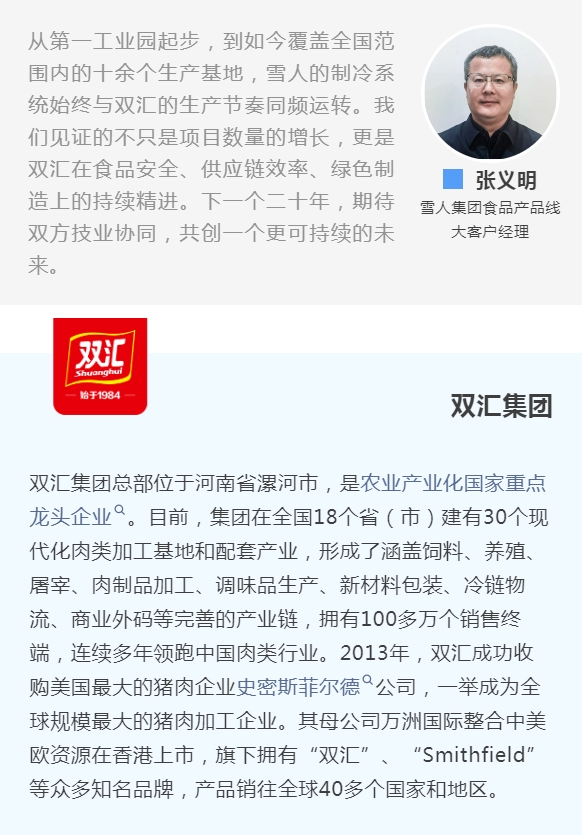 二十年風(fēng)雨同舟,雪人集團(tuán)將繼續(xù)與雙匯并肩,創(chuàng)新驅(qū)動,行穩(wěn)致遠(yuǎn),共赴美好未來!