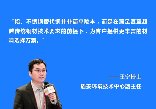 盾安環(huán)境技術(shù)中心副主任王寧博士應(yīng)邀參加并作《空調(diào)行業(yè)以鋁、不銹鋼代銅的發(fā)展與展望》主題報(bào)告,結(jié)合盾安在微通道換熱器、閥件、管路件等關(guān)鍵部件的應(yīng)用實(shí)踐,指出這一趨勢(shì)主要受成本、資源戰(zhàn)略、技術(shù)突破與環(huán)保理念多重因素共同推動(dòng)。