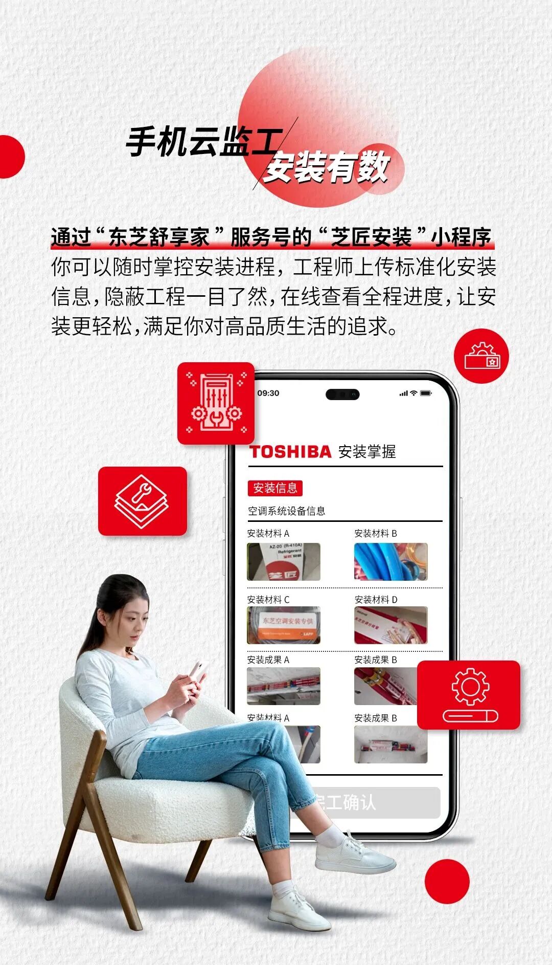 東芝空調(diào)芝匠安裝數(shù)字化平臺“手機云監(jiān)工”功能,讓安裝過程徹底“陽光化”。用戶通過“東芝舒享家”服務號的“芝匠安裝”小程序,可隨時查看安裝進程,工程師會實時上傳標準化安裝信息,原本隱蔽的施工細節(jié)清晰可見。這種全程可追溯的監(jiān)督模式,讓用戶無需親臨現(xiàn)場就能掌控質(zhì)量,滿足了對年輕用戶高品質(zhì)安裝服務的追求,徹底化解了“看不見、不放心”的焦慮。