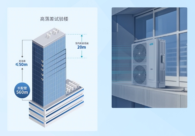 具備560m超長的冷媒配管長度和50m高落差設計,有效增加了設備布局的靈活性,能夠根據建筑的實際結構和空間特點,進行更為靈活、合理的布局。