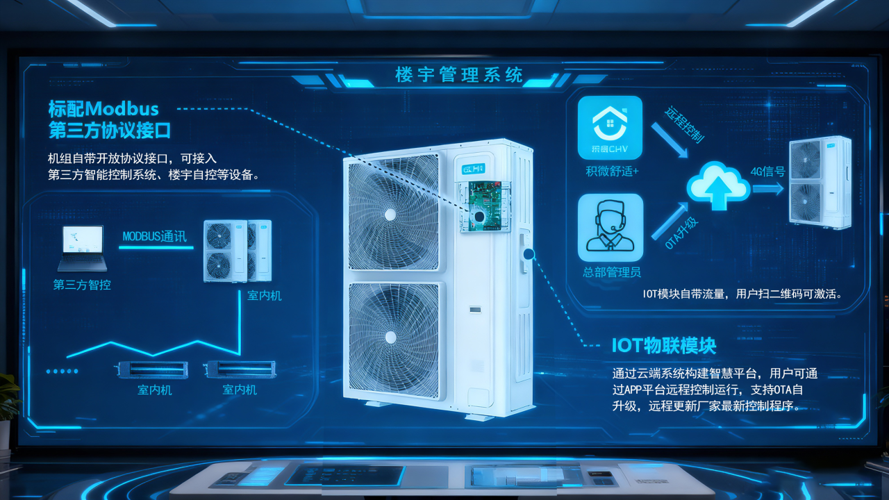 M系列智慧多聯機標配Modbus樓宇接口和物聯模塊,無論商場是沿用舊集控系統(tǒng)還是新增樓宇管理系統(tǒng),都能兼容對接,實現空調的統(tǒng)一管控。