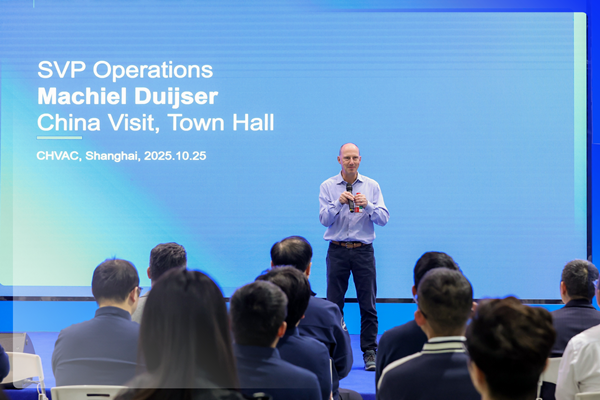 訪問期間,Machiel在上海、杭州分別召開員工大會(huì)(Townhall),與核心運(yùn)營團(tuán)隊(duì)進(jìn)行深入交流,慶祝開利一冷工廠30周年,并回顧“開利制造月”活動(dòng)精彩時(shí)刻。同時(shí),Machiel在員工大會(huì)現(xiàn)場(chǎng)表彰了在創(chuàng)新致勝、客戶服務(wù)以及精進(jìn)專業(yè)等方面取得優(yōu)異成就的團(tuán)隊(duì),鼓勵(lì)全員在保持全球視野的同時(shí),創(chuàng)新本土化發(fā)展,加強(qiáng)制造環(huán)節(jié)的數(shù)字化和智能化,將安全與效率融入日常運(yùn)營。