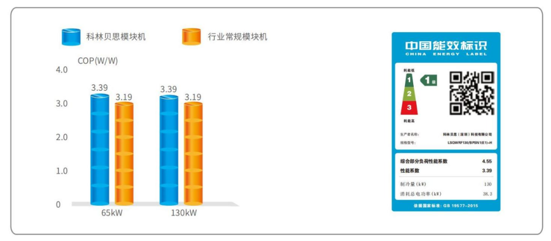 科林貝思模塊機(jī)組集高效壓縮機(jī),新一代高效換熱系統(tǒng),高精度電子膨脹閥等專業(yè)部件于一體,使得全系列機(jī)組COP均達(dá)到國(guó)家一級(jí)能效指標(biāo),獲得國(guó)家節(jié)能產(chǎn)品認(rèn)證。
