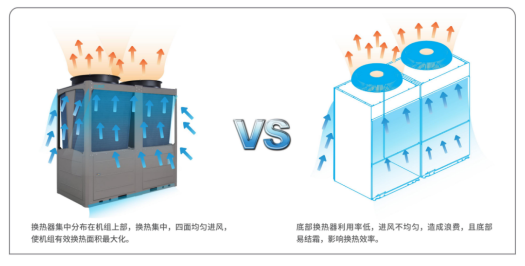 換熱器根據(jù)專業(yè)的溫度場(chǎng)模擬計(jì)算,創(chuàng)新設(shè)計(jì)環(huán)形回風(fēng),進(jìn)風(fēng)面積大,換熱有效面積增加,換熱效果顯著,而且冬季機(jī)組底部不易結(jié)霜。