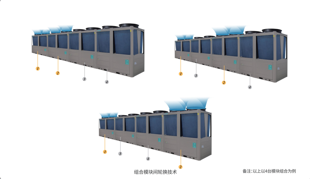 機(jī)組根據(jù)系統(tǒng)使用負(fù)荷情況,輪換設(shè)置優(yōu)先開(kāi)啟的模塊機(jī)組,平衡分配每臺(tái)模塊機(jī)組的運(yùn)行時(shí)間,大大提升機(jī)組的可靠性。