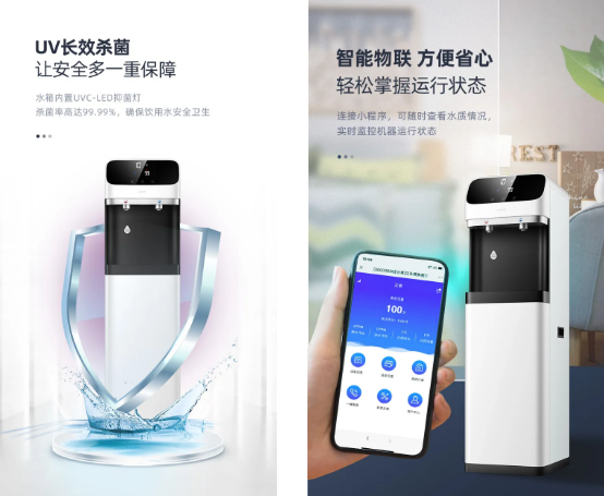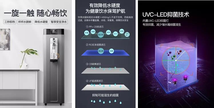 水箱內(nèi)置UVC-LED抑菌燈,長效抑菌,殺菌率高達(dá)99.99%,確保飲用水安全衛(wèi)生。智能濾芯壽命提醒,及時(shí)查看濾芯壽命,輕松換芯。智慧 LED 大屏顯示,觸摸操作,方便更省心。
