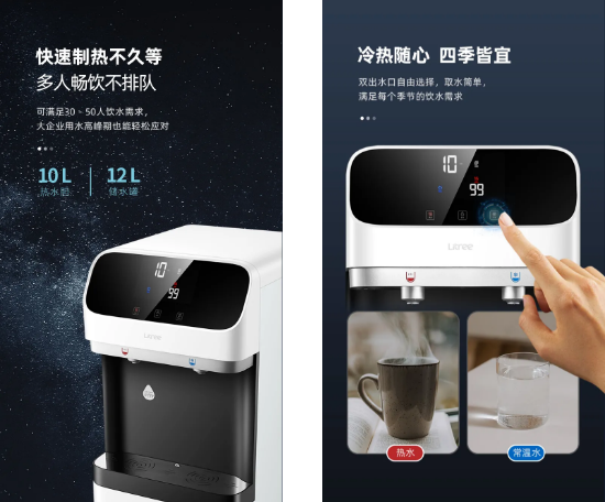 12L大容量儲(chǔ)水,可以滿足30-50人中大型辦公環(huán)境的飲水需求,快速制熱不用等待,用水高峰期也能輕松應(yīng)對(duì);雙出水口自由選擇,常溫水、熱水兩檔溫度調(diào)節(jié),精準(zhǔn)控溫,滿足不同用水需求。
