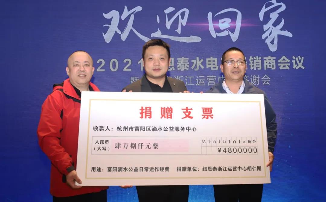 紐恩泰在發(fā)展同時不忘回報社會,多年來積極承擔(dān)社會責(zé)任,踐行社會公益,紐恩泰杭州運營中心負(fù)責(zé)人胡總也延續(xù)這種使命和擔(dān)當(dāng),多年來一直致力于公益事業(yè)的發(fā)展,用實際行動詮釋社會擔(dān)當(dāng)。在此次會議上,為杭州市富陽區(qū)滴水公益服務(wù)中心捐贈48000元,用于日常運作經(jīng)費。