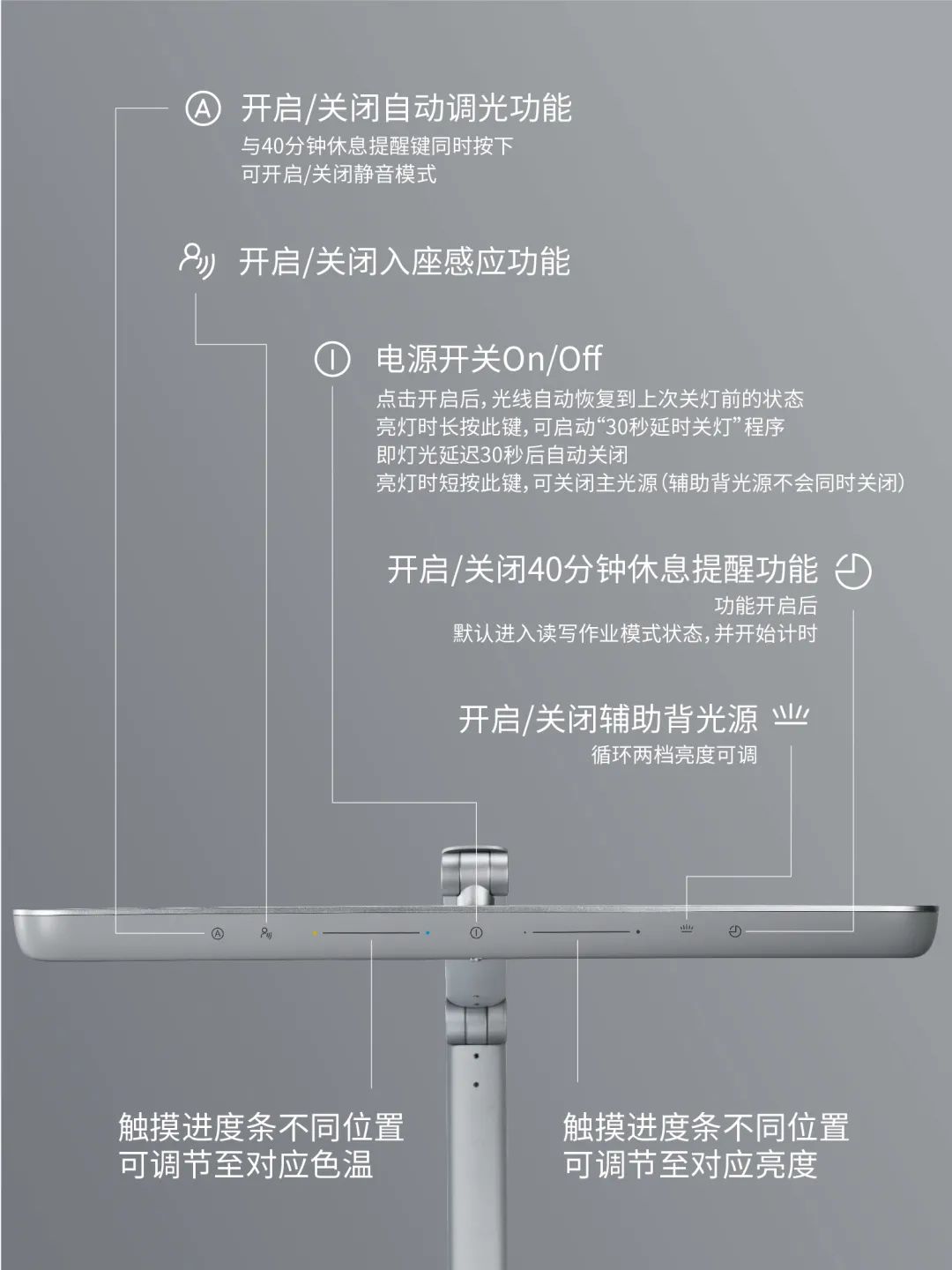 ●智能光感調(diào)節(jié):搭載的光敏傳感器實時監(jiān)測用光環(huán)境光線變化,并自動匹配最適合的光源亮度,讓桌面照度始終穩(wěn)定在最適合的亮度閾值,不必再為燈光太亮或太暗而發(fā)愁;