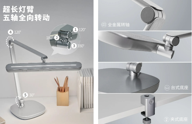 ●五軸全景燈頭和可靈活轉(zhuǎn)動的金屬長燈臂,可根據(jù)孩子的身高自由調(diào)控燈頭高度及方向;