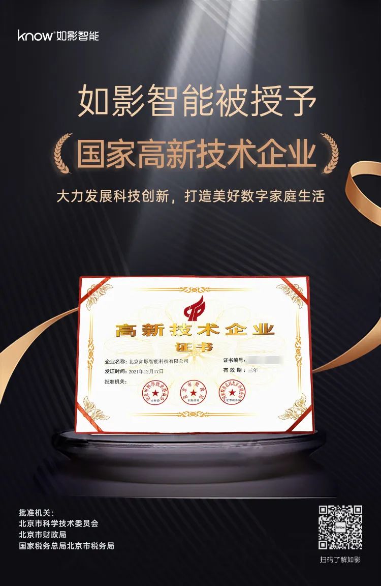 隨著如影智能穩(wěn)步發(fā)展,繼入選北京第二批「專精特新」企業(yè)之后,又被授予「國家高新技術(shù)企業(yè)」。再一次證明了,如影智能在智能家居賽道上迅猛發(fā)展得到國家和社會(huì)的認(rèn)可。更加堅(jiān)定了如影打造美好數(shù)字家庭生活的決心。