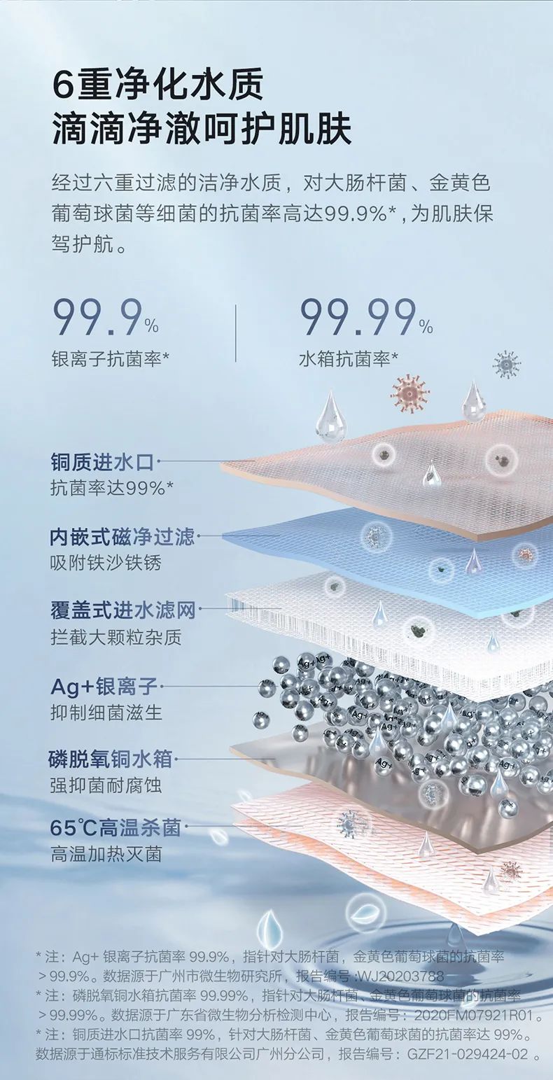 一般家中熱水器都是直接接入自來水,即使經(jīng)過凈化水中仍然存在易引起皮膚過敏的雜質(zhì),想要擁有潔凈的沐浴體驗,還需要關(guān)注水的源頭治理。云米Super 2 Max創(chuàng)新加入6重凈化水質(zhì)功能,通過內(nèi)部的Ag+銀離子、磷脫氧銅水箱、銅制進水口、內(nèi)嵌式磁凈過濾、覆蓋式進水濾網(wǎng)和65℃高溫殺菌6重過濾,實現(xiàn)對自來水的深度凈化,可以有效抑制大腸桿菌、金黃色葡萄球菌等細菌,抗菌率高達99.99%,為皮膚保駕護航,尤其對于家中有寶寶的家庭,必是首選。