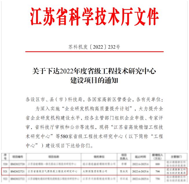 近日,江蘇省科學(xué)技術(shù)廳下發(fā)《關(guān)于下達2022年度省級工程技術(shù)研究中心建設(shè)項目的通知》,公布了2022年省級工程技術(shù)研究中心建設(shè)項目名單,太陽雨集團成功獲批“江蘇省高效空氣源熱泵工程技術(shù)研究中心”建設(shè)項目,太陽雨成為江蘇省唯一一家擁有省級空氣源熱泵工程技術(shù)研究中心的企業(yè)。