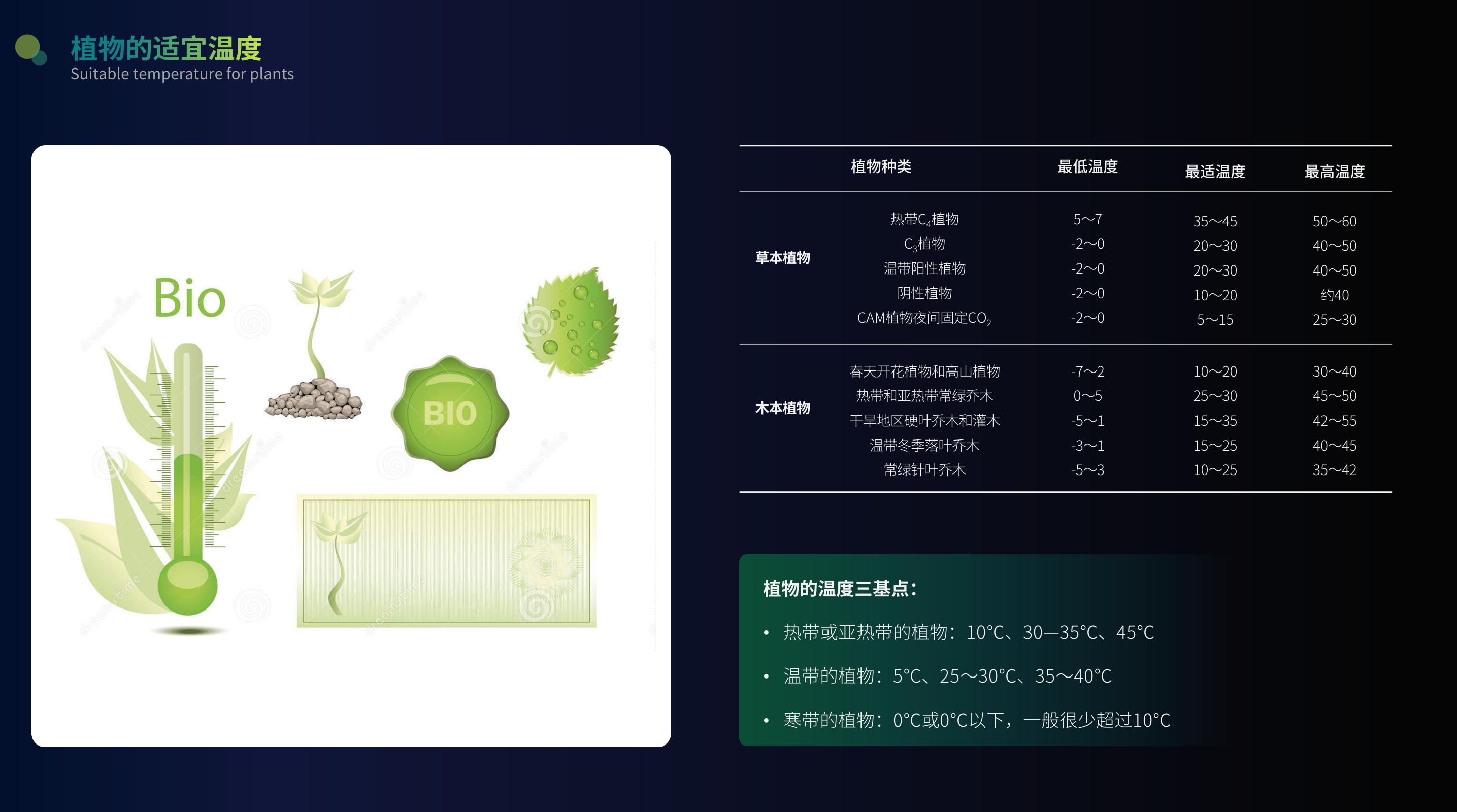 在提出我們的核心解決方案前,我們必須要了解植物生長(zhǎng)與溫度的重要關(guān)聯(lián)。一般來說植物生長(zhǎng)都有其對(duì)應(yīng)的生長(zhǎng)適宜溫度,而不同類型的植物所需要的溫度差別很大!以下圖為例,寒帶的植物生長(zhǎng)所需溫度與溫帶、熱帶植物生長(zhǎng)溫度,溫差在20-30℃左右!