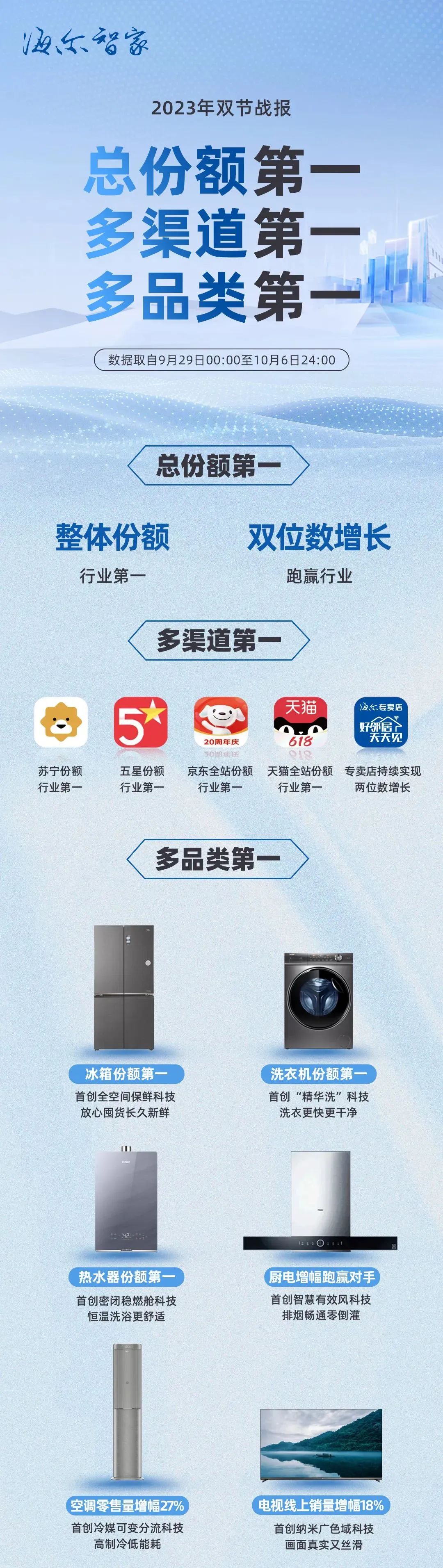 10月10日,海爾智家發(fā)布2023年中秋國(guó)慶雙節(jié)戰(zhàn)報(bào),獲得三個(gè)維度第一。首先是總份額第一,整體份額行業(yè)第一,雙位數(shù)增長(zhǎng)跑贏行業(yè);其次是多渠道第一,蘇寧、五星、京東、天貓份額均為行業(yè)第一,專賣店持續(xù)實(shí)現(xiàn)兩位數(shù)增長(zhǎng);最后是多品類第一,冰箱、洗衣機(jī)、熱水器等品類份額第一。