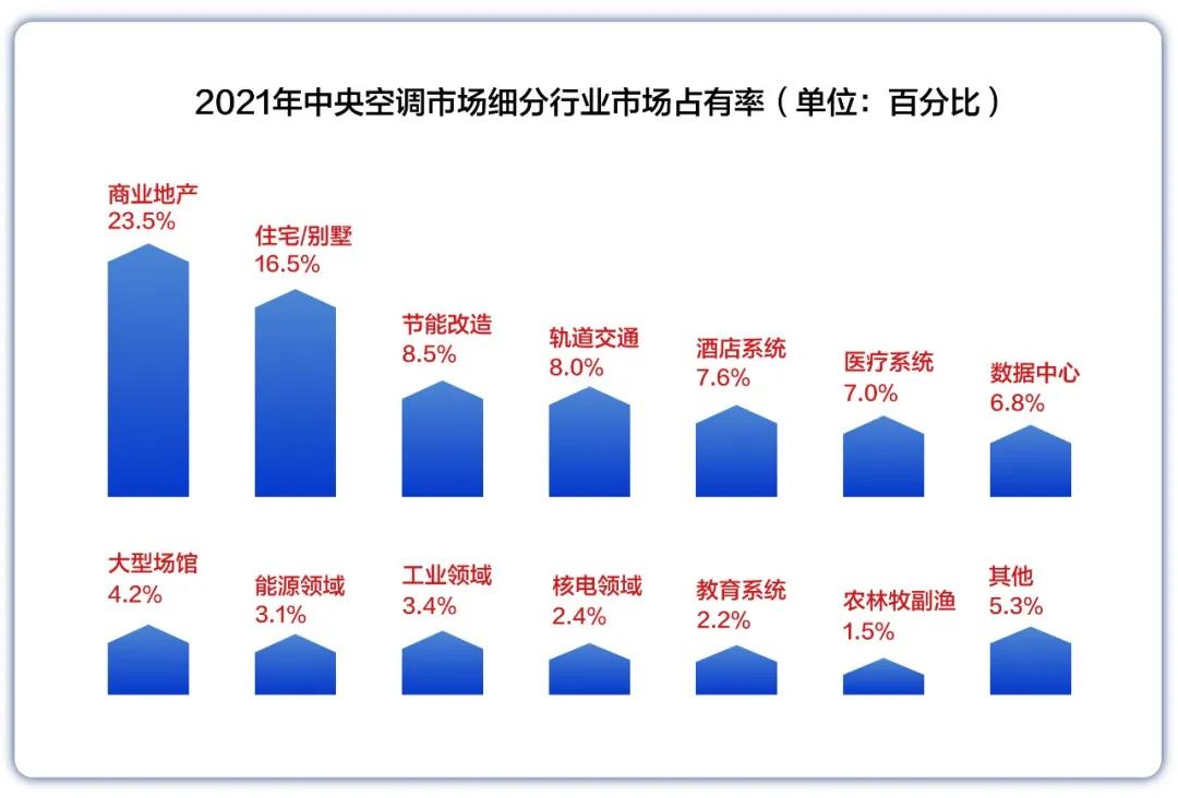 全民積極抗疫,醫(yī)療系統(tǒng)、基礎(chǔ)設(shè)施建設(shè)智能化布局逐漸完善,酒店、大型場館、核電領(lǐng)域、教育系統(tǒng)以及工業(yè)化工、新能源等細(xì)分行業(yè)穩(wěn)中有升,迎來新的發(fā)展風(fēng)口。值得一提的是農(nóng)林牧副漁為市場帶來一股“清風(fēng)”,為逐漸成熟的中央空調(diào)市場帶來新的增長點(diǎn)。
