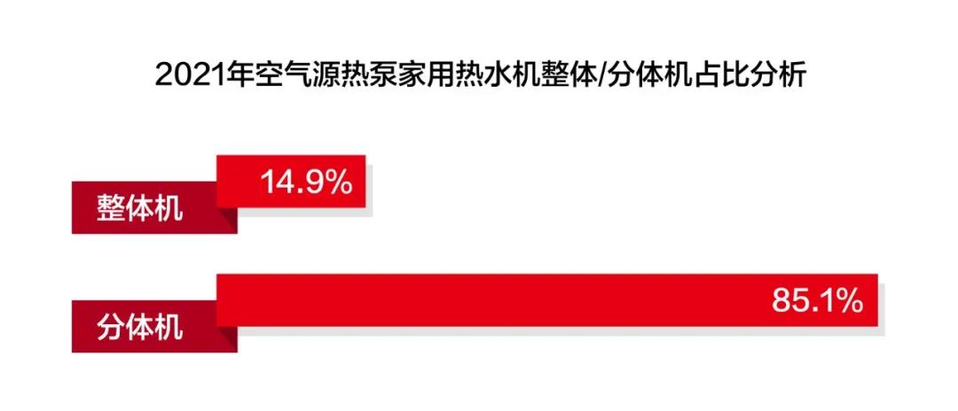 2021年的熱泵家用熱水市場,零售渠道下滑依舊,樓盤配套上升明顯。其中,分體式家用機性價比高,技術(shù)和生產(chǎn)工藝成熟,隨著樓盤配套市場的發(fā)力,讓分體式產(chǎn)品市場份額不斷攀升;安裝簡單、造型優(yōu)美是整體式家用機的優(yōu)點,價格偏高則是制約其難以快速普及的因素。可以預(yù)見,在消費品味提升的基礎(chǔ)上,整體式家用機市場將會有所提升,但目前分體式家用機依然是市場上的主力機型。