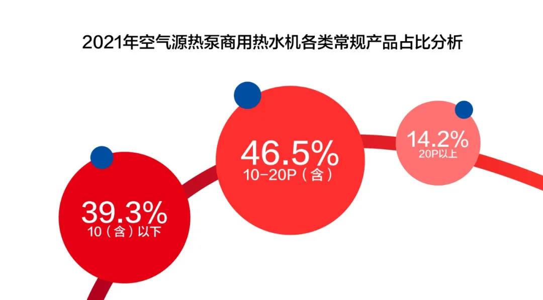 2021年,小型熱水項目的模塊化方面得到進一步優(yōu)化提升,主要集中在 5P、10P 的標(biāo)準(zhǔn)化機型,占比達(dá)到39.3%;中型項目傾向于10-20P的機型,其便于組合成用戶所需的各種配比系統(tǒng),受到渠道商和用戶青睞,占比達(dá)到46.5%;剩下14.2%的市場份額為20P以上大型機組。值得說明的是,20P以上機型在商用熱水市場的比重正逐年遞增。