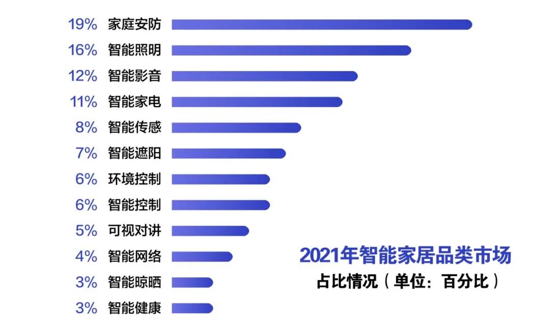 從細(xì)分市場的占比來看,智能家居品類中智能安防、智能照明、智能家電、智能影音占據(jù)最大額的市場份額。家庭安防包含了智能門鎖、智能安防傳感器與智能攝像機(jī)等產(chǎn)品。