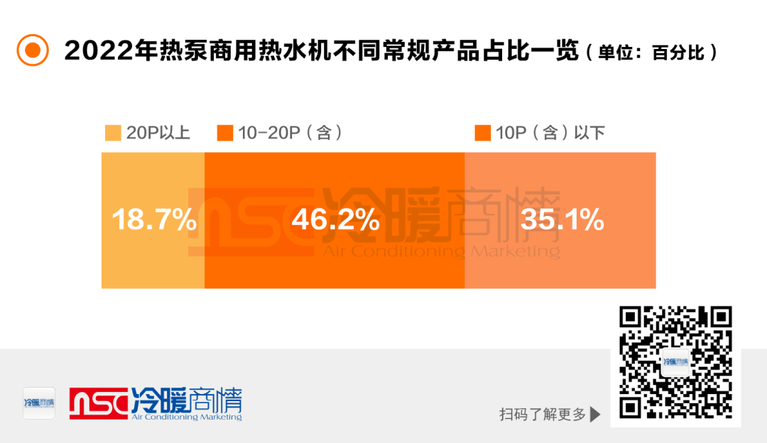 商用熱水的主力機型是10-20P(含),市場占有率依然超45%,該區(qū)間產(chǎn)品機型搭配靈活,供多場所使用。10P(含)以下的標準化產(chǎn)品機型得到進一步優(yōu)化,市場占比達35%以上。
