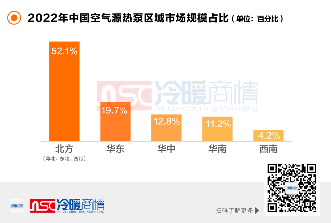 從區(qū)域市場來看,目前我國空氣源熱泵行業(yè)主要消費市場集中在北方地區(qū)(華北、西北、東北),占據(jù)全國市場超半的份額。在北方市場,采暖市場份額高達80%以上接近90%,特別是北方清潔供暖市場的開拓,對支撐整個地區(qū)的市場規(guī)模起到?jīng)Q定性的利好作用。