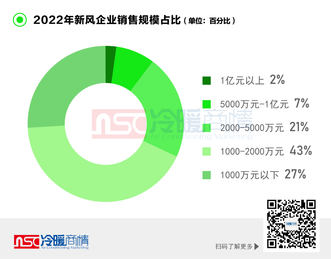 據(jù)冷暖商情統(tǒng)計,目前國內(nèi)共有600余家新風企業(yè),在這些企業(yè)中,2022年銷售額突破1億大關的品牌僅占總數(shù)的2%,銷量在5000萬元到1億元的品牌占比7%,2000萬-5000萬元的品牌占比為21%,1000萬元-2000萬元的品牌占比43%,1000萬元以下品牌則占比27%。