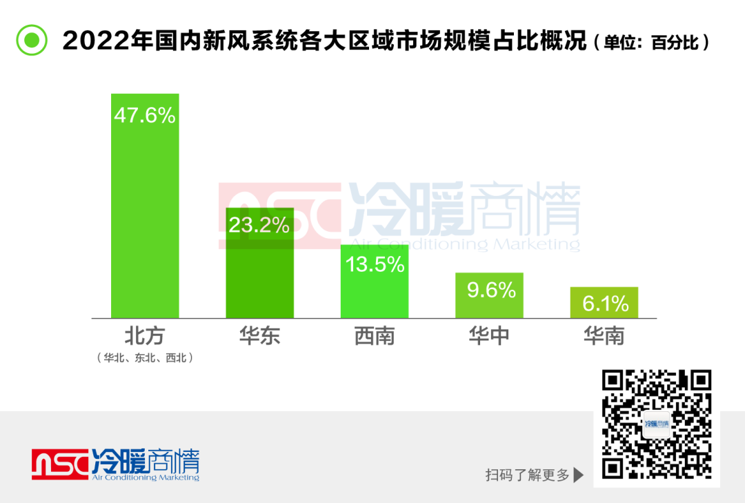 其中北方地區(qū)(華北、東北、西北)是目前能量回收式新風系統(tǒng)的主要市場,同時部分廠商也根據(jù)氣候特點更多的引入了加濕的功能,規(guī)模占比47.6%;