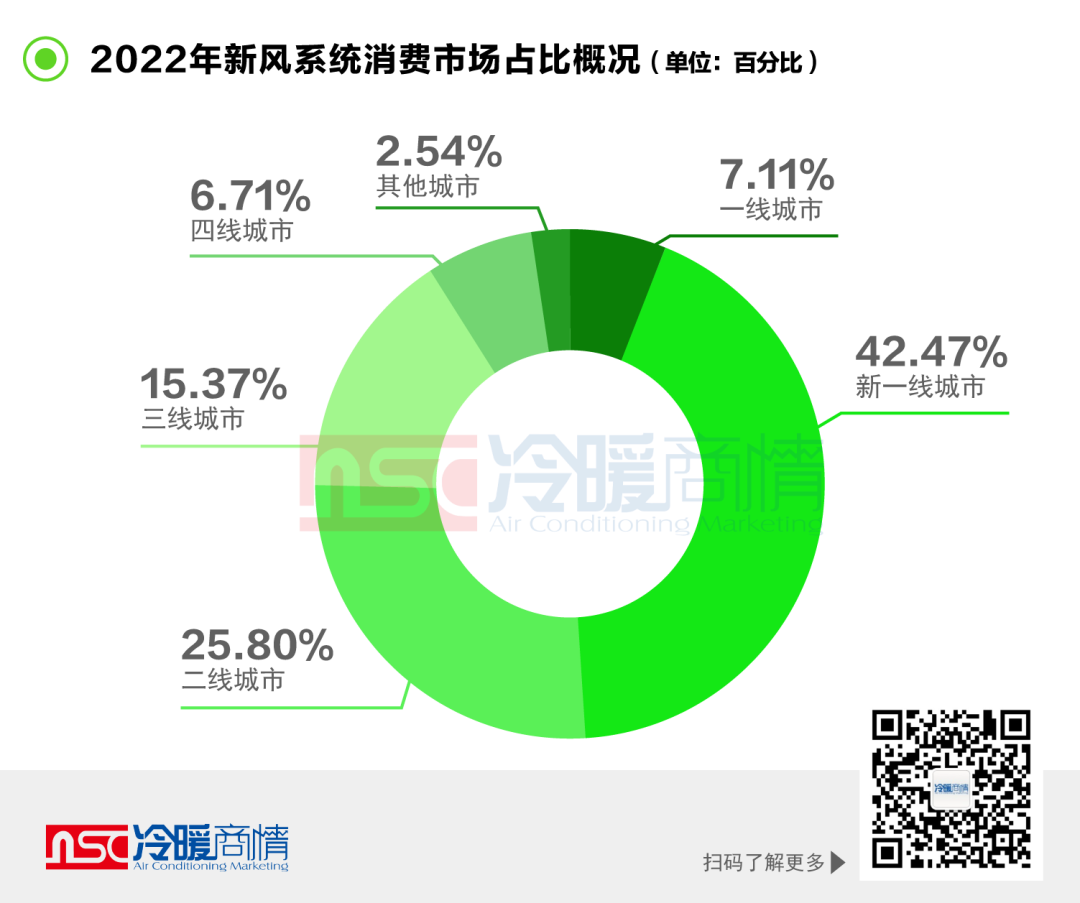 目前,新風系統(tǒng)消費市場主要集中于新一線城市與重點二線城市,2022年新一線城市住宅新風系統(tǒng)市場規(guī)模占比42.47%,二線城市市場規(guī)模占比25.80%。