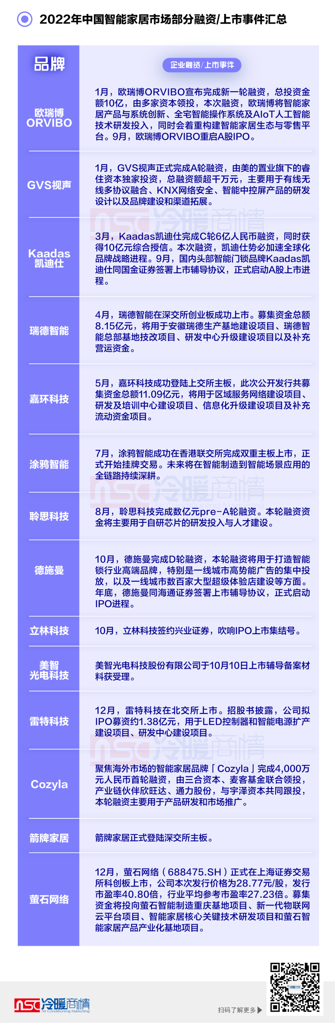 2022年智能家居產(chǎn)業(yè)進(jìn)一步發(fā)展,獲得融資、IPO成功過會(huì)、重啟IPO等比比皆是。1月,歐瑞博率先打響2022智能家居融資“第一炮”總投資金額10億;GVS視聲完成A輪融資;凱迪仕完成C輪6億人民幣融資和獲得10億元綜合授信;德施曼完成D輪融資;海外智能家居品牌Cozyla完成4,000萬元人民幣首輪融資;瑞德智能在深交所創(chuàng)業(yè)板成功上市、箭牌家居正式登陸深交所主板、杭州螢石網(wǎng)絡(luò)股份有限公司發(fā)布招股意向書,擬登陸上交所科創(chuàng)板......