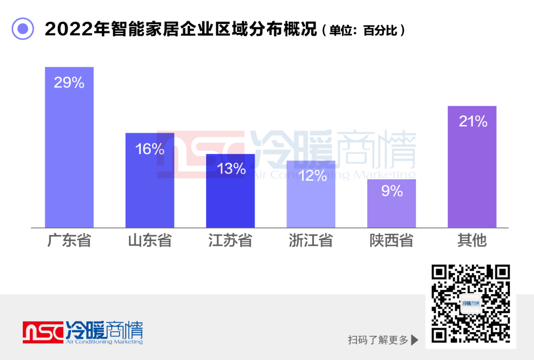 我國智能家居行業(yè)企業(yè)數(shù)量較多,從區(qū)域分布來看,企業(yè)數(shù)量最多的地區(qū)為廣東省,其次為山東、江蘇、浙江、陜西等,東南部地區(qū)整體分布更為集中。