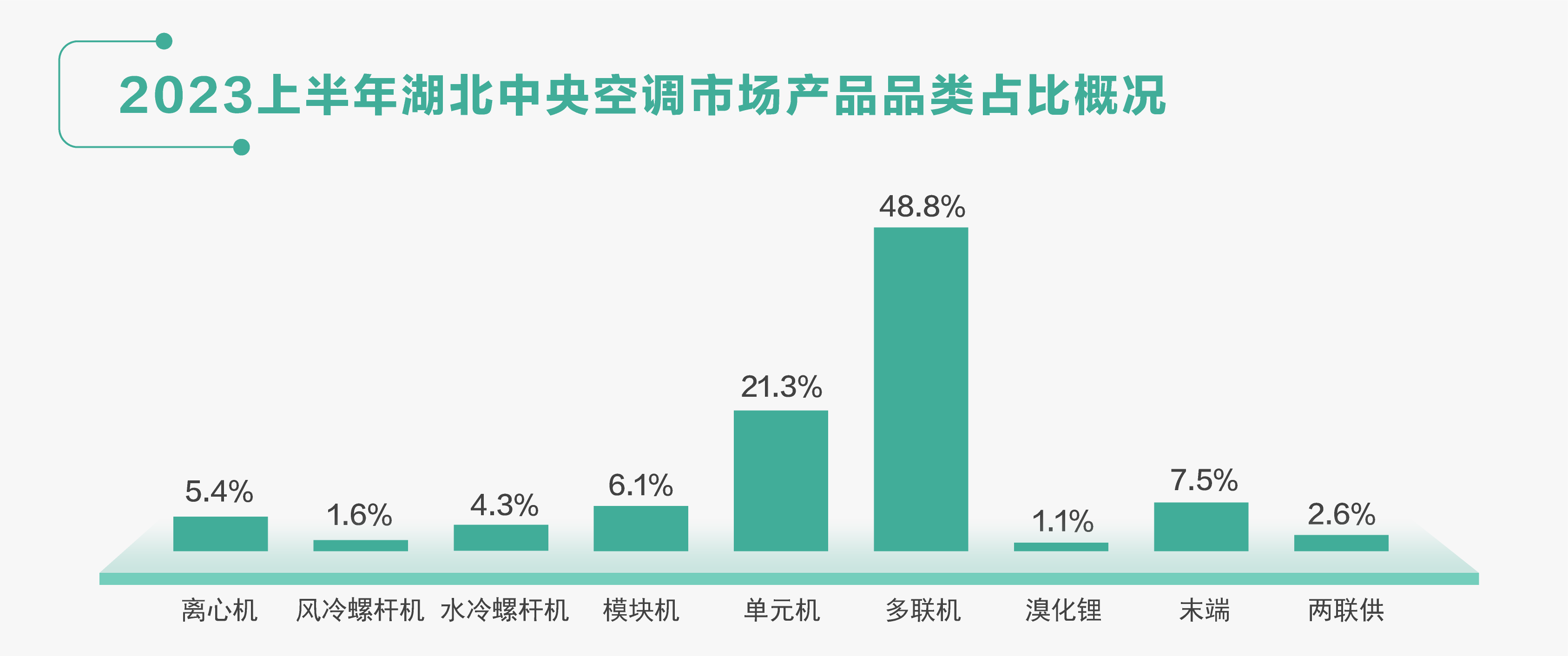 產(chǎn)品方面,湖北中央空調(diào)市場前五名為:多聯(lián)機、單元機、末端、模塊機、離心機。多聯(lián)機組依然位居湖北市場第一大產(chǎn)品品類,占比為48.8%、單元機占比21.3%、末端7.5%、模塊機6.1%、離心機5.4%。