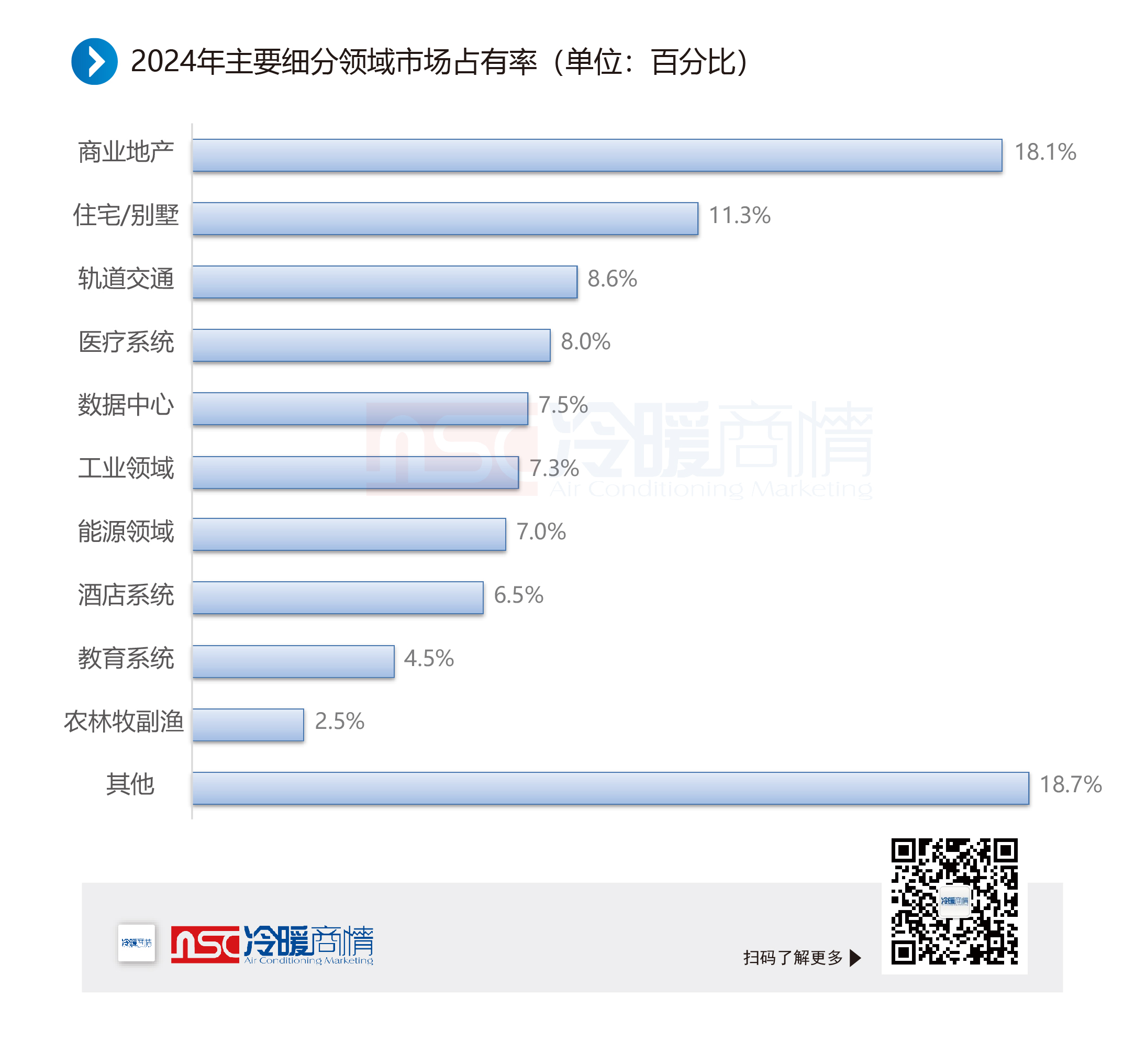 2024年,中央空調(diào)市場細(xì)分版圖在新經(jīng)濟(jì)浪潮中加速擴(kuò)張,雖說零售市場面臨更大挑戰(zhàn),不過民生類、工業(yè)、改造等市場得到積極關(guān)注,特別是以舊改政策推動的綠色建筑和節(jié)能減排、新基建領(lǐng)域需求進(jìn)一步提升。據(jù)細(xì)分市場分析,軌道交通、數(shù)據(jù)中心、5G基站等領(lǐng)域得到發(fā)展,政府主導(dǎo)的基礎(chǔ)設(shè)施、石化、制造業(yè),尤其是高端制造業(yè)如航空航天、新能源汽車、高端裝備,展現(xiàn)出一定的發(fā)展?jié)摿Α?/span>