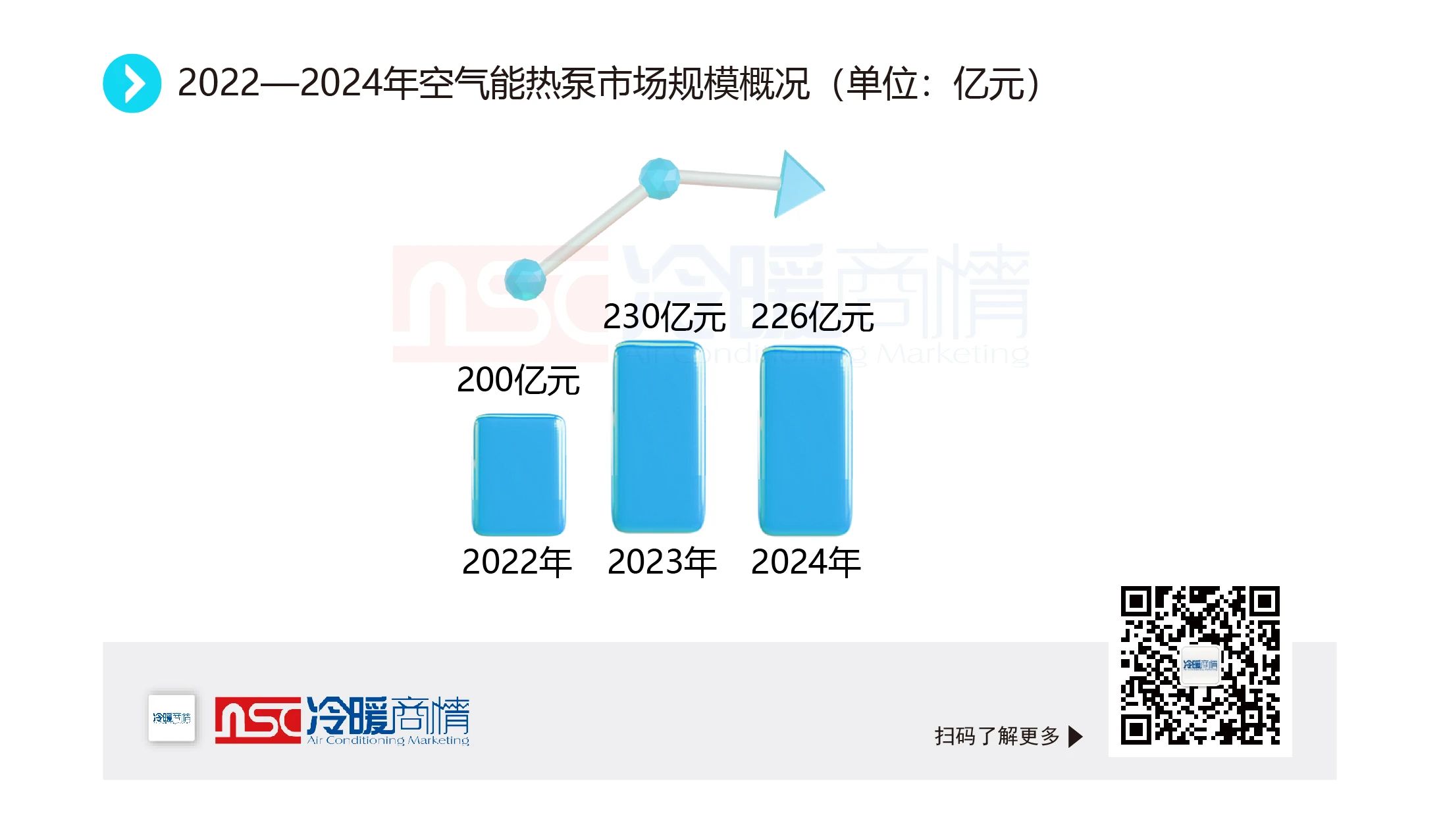 在政策與技術(shù)升級等多重因素影響下,2024年,空氣能熱泵市場總銷售額達(dá)到約226億元。這一數(shù)據(jù)表明,2024年中國空氣能熱泵市場在相對穩(wěn)定發(fā)展中有輕微下滑1.7%。