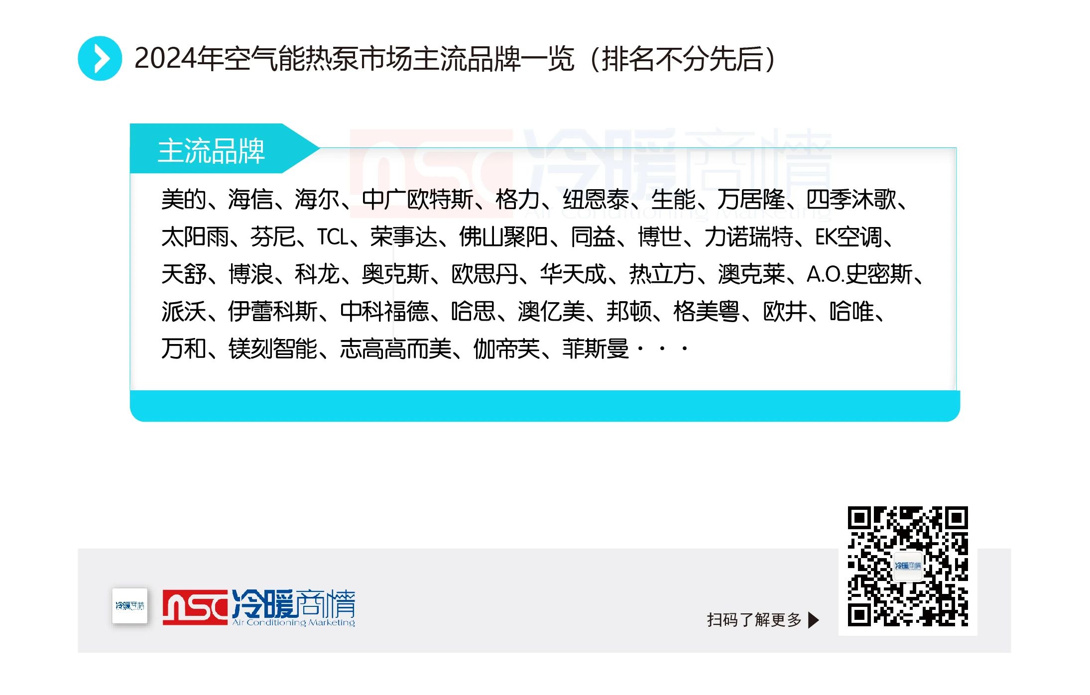 目前,中國的空氣能熱泵市場呈現(xiàn)出“百花齊放”的格局,眾多品牌競爭激烈。其中,以美的、海信、海爾、格力等為代表的暖通空調(diào)品牌在市場上占據(jù)了主導(dǎo)地位。同時(shí),如中廣歐特斯、芬尼、紐恩泰、澳億美、博世、威能、熱立方、A.O.史密斯、四季沐歌、生能、歐思丹、同益、太陽雨、萬居隆等,通過自身不斷的積累及深耕在市場中占據(jù)一定的份額。