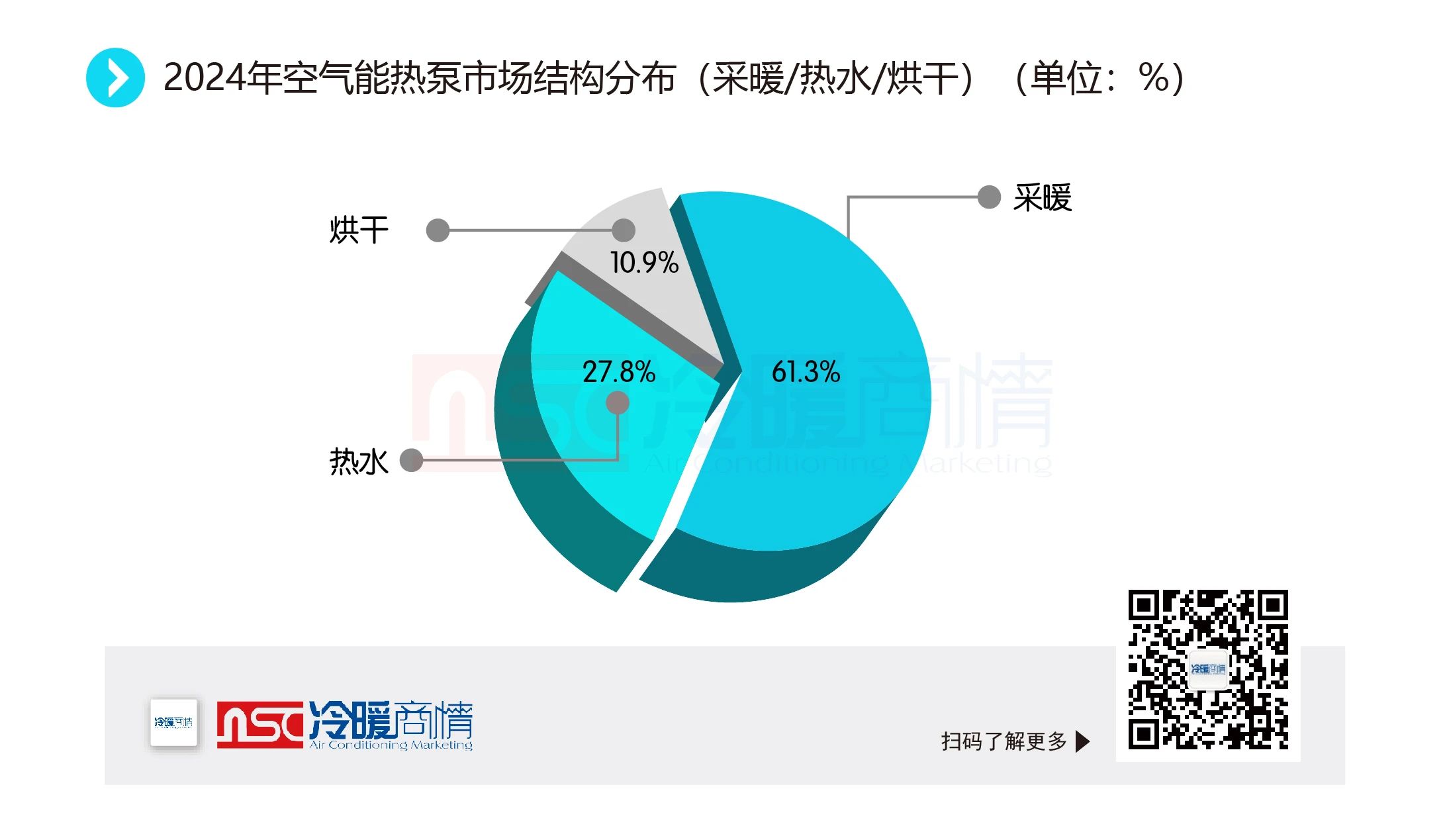 2024年,空氣源熱泵在采暖、熱水、烘干等領(lǐng)域都有廣泛應(yīng)用。其中,采暖、熱水、烘干三大應(yīng)用領(lǐng)域占比分別為61.3%、27.8%、10.9%。