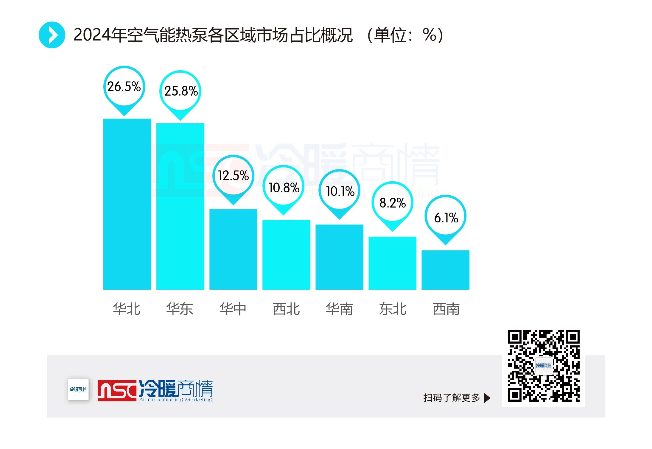2024年我國空氣能熱泵在北方地區(qū)(華北、東北、西北)、華東市場表現(xiàn)突出,華南、華中、西南區(qū)域表現(xiàn)一般。