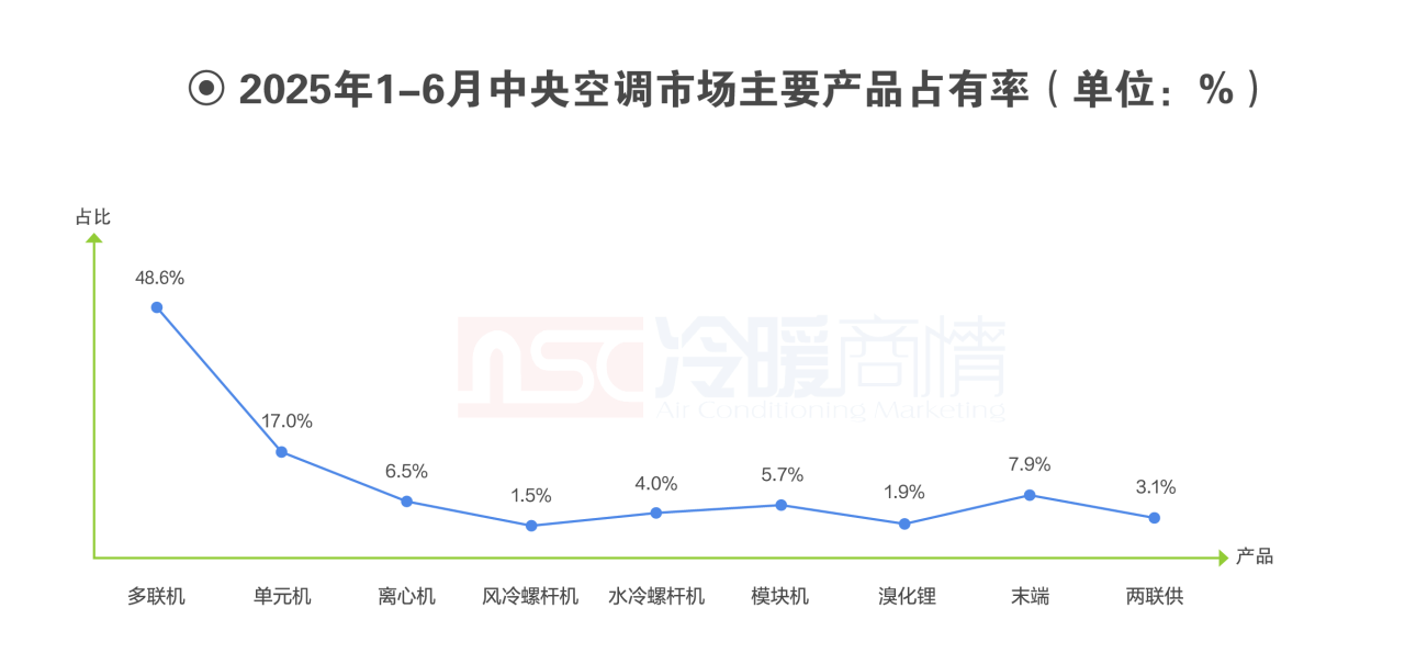 從產(chǎn)品結(jié)構來看,多聯(lián)機仍是中央空調(diào)行業(yè)的主力產(chǎn)品。在2025上半年,多聯(lián)機占據(jù)48.6%的份額;其他產(chǎn)品各自占據(jù)一定的市場份額。