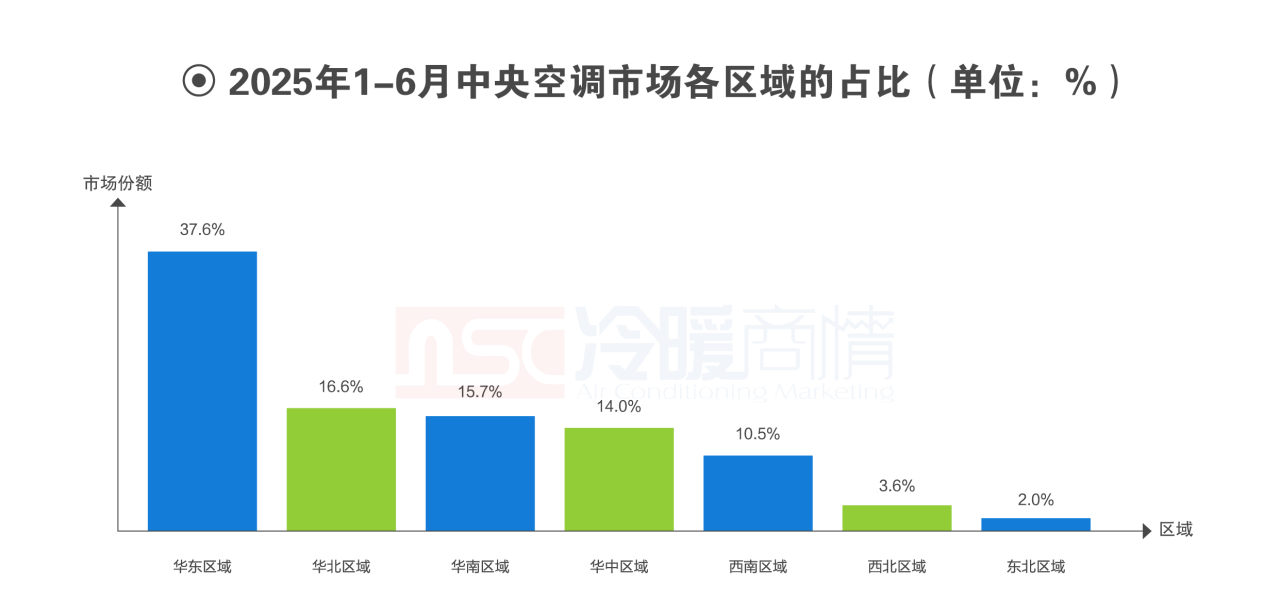 從區(qū)域市場表現(xiàn)來看,華東地區(qū)依然是中央空調(diào)的最大消費市場,占全國市場份額的37.6%;華北地區(qū)緊隨其后,占比約為16.6%;華南地區(qū)則為15.7%;華中區(qū)域為14.0%。西南區(qū)域10.5%。